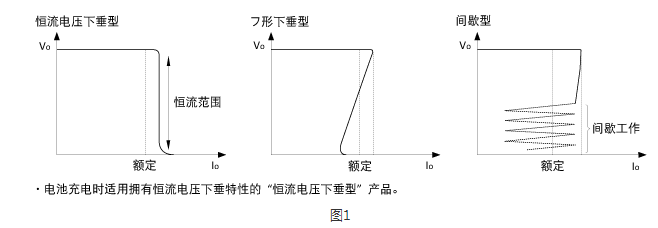 圖1中有三個(gè)主電源的過流保護(hù)特性。其中,適合電池充電的方式是擁有恒流電壓下垂特性的電源。通過運(yùn)用其恒流范圍,可以對(duì)電池進(jìn)行恒流充電。另外兩個(gè)特性不適合對(duì)電池充電,所以在選擇電源時(shí)要注意。
