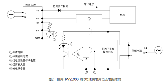 另一種控制恒流的方法是將外部電路連接到電源上,而不是像前面解釋的那樣通過過流保護(hù)轉(zhuǎn)移電流。以TDK的HWS1000為例來解釋這個(gè)過程:并聯(lián)電阻應(yīng)用在電源的負(fù)載線上,輸出電流的電壓轉(zhuǎn)換是通過并聯(lián)電阻實(shí)現(xiàn)的,并進(jìn)行輸出電流檢測(cè)。設(shè)計(jì)了恒流下垂點(diǎn)的調(diào)節(jié)電路,并建立了過流的標(biāo)準(zhǔn)電壓。在運(yùn)算放大器中比較(2)和(3)的電壓,在光耦合器中控制電源的輸出電壓。